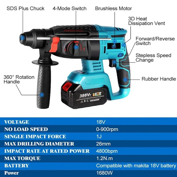 Descoperă puterea, precizia și durabilitatea într-un singur echipament profesional! Ciocanul rotopercutor LEIHMANN Germany este alegerea perfectă pentru cei care au nevoie de performanță în lucrările de foraj, dăltuire sau demolare – fie că ești profesionist, meșter sau pasionat de bricolaj. Alimentat cu acumulator, îți oferă libertate totală de mișcare și eficiență maximă.
