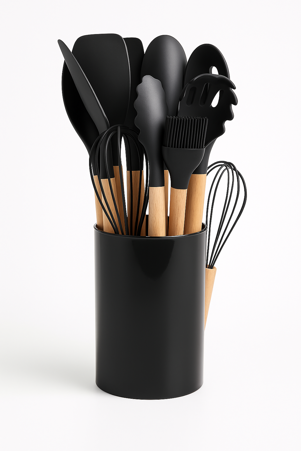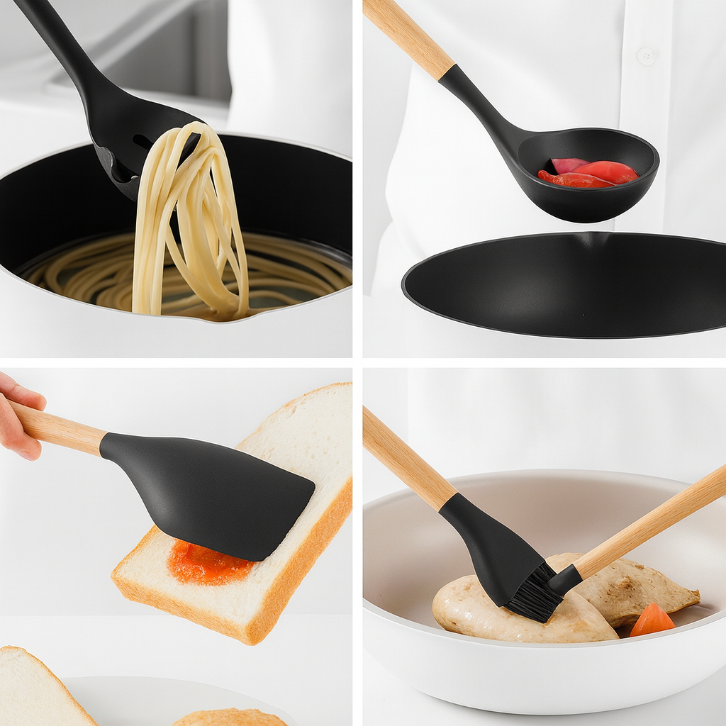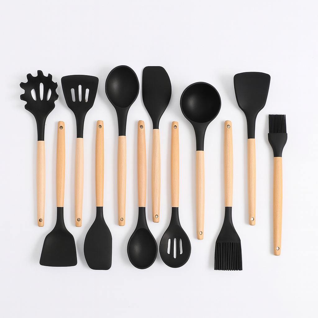 ✅ Set complet de 12 piese – tot ce ai nevoie pentru gătit zilnic: spatule, linguri, pensetă, tel, pensulă, polonic și recipient inox.