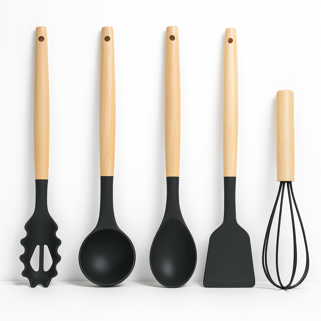 Acest set profesional combină designul modern cu utilitatea practică, fiind perfect pentru orice bucătărie. Fabricate din silicon alimentar fără BPA și mânere din lemn natural, ustensilele protejează vasele antiaderente și rezistă la temperaturi de până la 230°C.